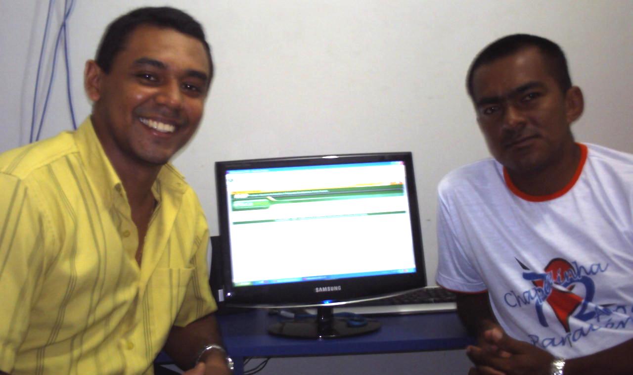 Nesta foto, Emanuel e Clodoaldo, Operadores Municipais Másters (OMM), que são responsáveis técnicos pela coleta das informações referentes a frequência dos beneficiários e transmissão desses dados no sistema do MEC, no Departamento de Frequência Escolar da SEMED/Chapadinha.
